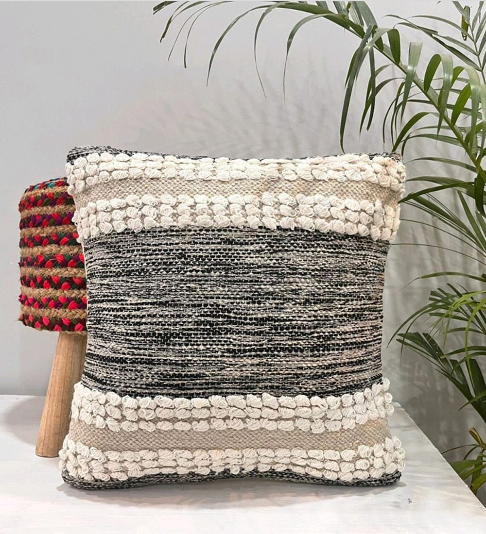 Enhance your home décor with our Cotton Handloom Tufted Cushion Cover, crafted with intricate handloom techniques for a touch of elegance and texture. Featuring a stylish combination of white, light brown, and black, this cushion cover adds a modern yet earthy vibe to any space. The tufted detailing provides a soft and cozy feel, making it a perfect accent for sofas, chairs, or beds.