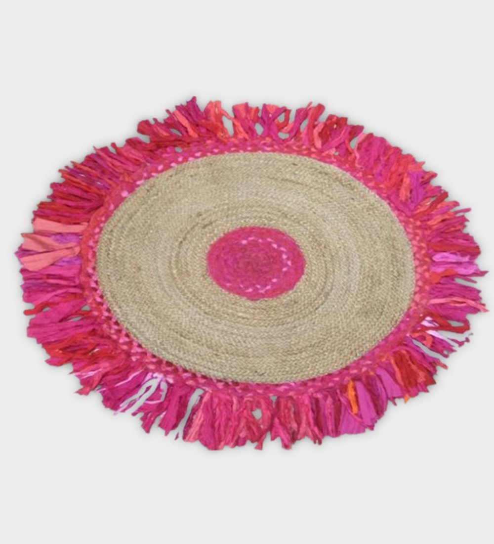 Bring sustainable elegance to your table with our eco-friendly 3ft round placemats, crafted from 30% jute braided and 70% recycled fibers. Featuring a vibrant pink-red and natural jute color combination with fringed edges, these durable 2000 GSM placemats offer both protection and style for everyday meals and special occasions.