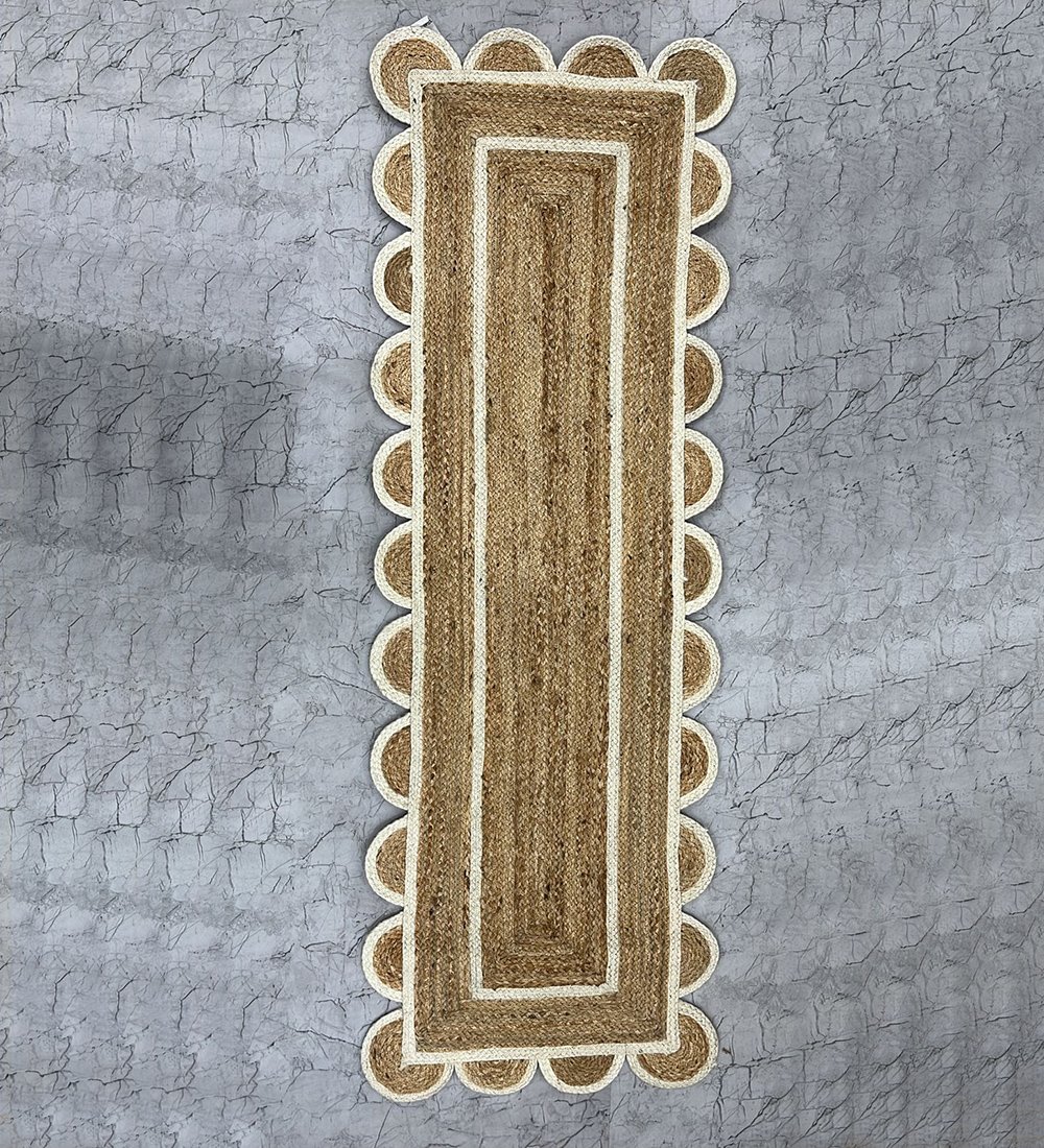 Bring a touch of rustic elegance to your space with our Jute Scallop Handmade Bohemian Runner Rug. Crafted from natural jute, this beautifully handwoven runner features a warm brown tone complemented by a delicate white scallop border, adding a stylish and earthy charm. Perfect for hallways, dining tables, or accent spaces, this rug enhances any boho-inspired or modern home décor.